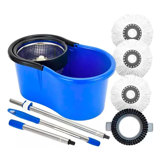 Mop Giratório Esfregão 360 Cesto Inox + 4 Refil Azul