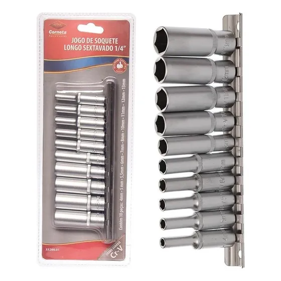Jogo 10pçs Soquete Pito Longo Sextavado 1/4 Corneta 4 A 13mm