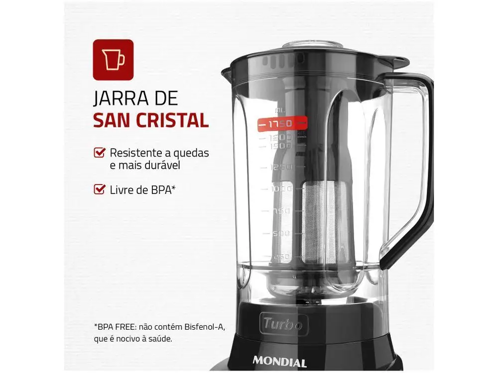 Robusto e potente o liquidificador Turbo L-900 FB Preto da Mondial é um produto ideal para você que busca alto desempenho na cozinha e elegantes para preparar deliciosas receitas para toda a família. Com motor superpotente ele oferece 900W de potência para preparar vários tipos de alimentos, copo tamanho família super-resistente com capacidade total de 2,7L e capacidade útil de 1,6L, com novo sistema de encaixe mais prático e fácil de montar. Conta com 5 velocidades mais a função Pulsar, assim você escolhe a velocidade ideal para o tipo de ingrediente a ser preparado como açaí, vitaminas, congelados, mousses, smoothies e muito mais. E ainda, para facilitar o preparo de suas refeições, acompanha filtro para coar sucos ou molhos separando o semente e o bagaço.