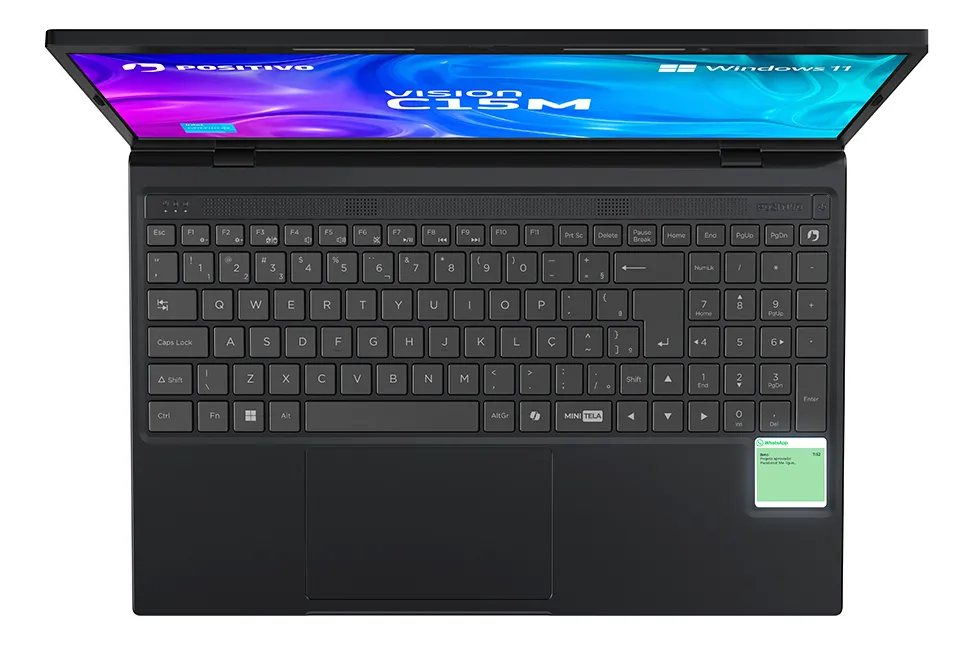 O notebook que acompanha seu ritmo. Uma tela para o estudo, outra para sua vida! O Positivo Vision C15M com Minitela é o notebook ideal para quem busca praticidade e inovação no estudo e no trabalho. É mais que um notebook, é a resposta para quem precisa de um novo nível de interatividade, organização e estilo no dia a dia com um diferencial exclusivo: a Minitela. Essa tela secundária, de 1,54” IPS com resolução de 240×240 é um diferencial exclusivo que coloca notificações do WhatsApp, lembretes, status do dispositivo, previsão do tempo e imagens/GIFs sempre ao alcance dos seus olhos — sem interromper o que está fazendo na tela principal. Ideal para estudantes e profissionais que buscam produtividade e inovação em um único equipamento. Equipado com o processador Celeron N4500 da plataforma Jasper Lake, oferece desempenho confiável para atividades essenciais como navegação na web, edições de texto e planilhas. A tela de 15,6” com tecnologia IPS FHD antirreflexo entrega imagens nítidas mesmo sob iluminação intensa. A webcam HD com a tecnologia Lumina Bar, barras de LED com ajuste de 3 níveis de intensidade que proporcionam uma iluminação ideal para a captação de imagem da webcam, otimizando chamadas de vídeo auxiliando no uso do teclado em ambientes com pouca iluminação. O notebook ainda conta com design moderno, mais fino e elegante, teclado com sistema de elevação para maior conforto e tecla Copilot dedicada, trazendo ainda mais eficiência para inteligência artificial que transforma comandos em resultados: redige textos, resume conteúdos, gera ideias criativas e até ajuda com planilhas e apresentações. Deixe suas tarefas mais simples, rápidas e intuitivas com um notebook que entende você. A conectividade também se destaca: são quatro portas USB (incluindo uma USB-C), Wi-Fi 5 com slot M.2 substituível, HDMI e entrada/saída de áudio, oferecendo total liberdade de conexão com seus periféricos. Outro destaque é o sistema fanless, que elimina ruídos e superaquecimento, garantindo maior conforto em uso prolongado. E com o software exclusivo Positivo Control Center, o usuário tem um maior controle do desempenho, além de um diagnostico completo do produto. Com performance otimizada, o Vision C15M oferece mais controle e praticidade com a MIA – sua assistente virtual que auxiliar nas tarefas do dia a dia com ajuda de Inteligência Artificial. Com foco em produtividade, o Positivo Vision C15M chega com diferenciais reais, com estilo, funcionalidade e uma experiência personalizada para um público conectado e exigente. Principais características: • Minitela integrada para lembretes, notificações do WhatsApp, mensagens, previsão do tempo, imagens, GIFs animados e atalhos; • Processador Intel Celeron N4500 da plataforma Jasper Lake; • Tela principal de 15,6” Full HD com painel IPS antirreflexo; • Tecla Copilot, com um toque e agilize suas tarefas utilizando IA; • Lumina Bar: iluminação com 3 níveis para videochamadas mais nítidas; • Conectividade Wi-Fi 5 com slot M.2 substituível; • Sistema fanless: uso silencioso e sem superaquecimento; • Design fino, elegante e com teclado elevado para mais conforto; • Positivo Control Center: monitore desempenho e diagnostique o notebook. • Positivo MIA: assistente virtual com inteligência artificial para mais eficiência. Aviso legal • A duração da bateria depende do uso que se dê ao produto.