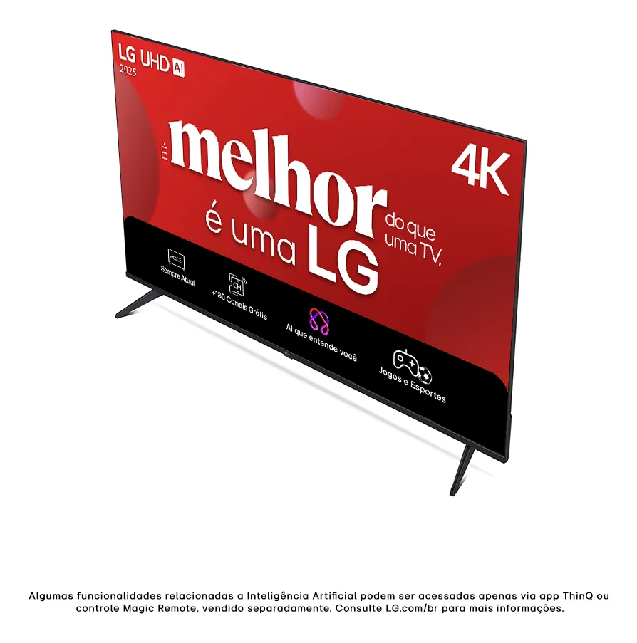 Principais recursos Cores e detalhes de tirar o fôlego com o 4K HDR10 Pro Qualidade de imagem 4K, visual aprimorado e áudio surround com o processador alpha 7 4K AI Gen8 Aproveite a resolução, o brilho e a clareza aprimorados do 4K Super Upscaling Alta resolução em uma enorme tela de TV ultragrande IMAGEM (DISPLAY) Tipo de Painel 4K UHD Resolução 4K Ultra HD (3.840 x 2.160) Iluminação do painel Direto Frequência Nativa 60Hz Nativo IMAGEM (PROCESSAMENTO) Processador a7 AI Processor 4K Gen8 Upscaler AI 4K Super Upscaling Dynamic Tone Mapping HDR (High Dynamic Range) HDR10 / HLG FILMMAKER MODE Modo de Imagem 10 modos Auto Calibração DIMENSÕES E PESOS Dimensões sem base (LxAxP) 1455 x 841 x 67,9 Dimensões com base (LxAxP) 1455 x 904 x 269 Dimensões da embalagem (LxAxP) 1580 x 950 x 162 Base da TV (LxAxP) 1217 x 269 Peso sem base 16,5 Peso com base 16,7 Peso da embalagem 22,4 Suporte Vesa (LxA) 300 x 200 CÓDIGO DE BARRAS Código de Barras 7893299000171 CONECTIVIDADE Retorno de Canal de Áudio eARC (HDMI 2) Bluetooth Support Sim (V5.0) Ethernet 1ea Simplink (HDMI CEC) SPDIF (Saída de Áudio Digital Óptica) 1ea Entrada HDMI 3 (suporta eARC, ALLM) Entrada de RF (Antena/Cabo) 1ea USB 1ea (v 2.0) Wi-Fi Sim (Wi-Fi 5) SMART TV Sistema Operacional webOS 25 Compatível com Câmera USB AI Chatbot Web Browser Completo Google Cast Google Home / Hub Home Hub Reconhecimento Inteligente de Voz Compatível (controle Smart Magic vendido separadamente) LG Channels Controle Smart Magic Compatível (controle Smart Magic vendido separadamente) App de Controle pelo Smartphone (LG ThinQ) Reconhecimento de Voz Compatível (controle Smart Magic vendido separadamente) Compatível com Apple Airplay Compatível com Apple Home ALIMENTAÇÃO Voltagem AC 100~240V 50-60Hz Consumo de energia em stand by Abaixo de 0,5W ACESSÓRIOS INCLUÍDOS Controle Remoto Padrão Cabo de Força (Destacável)