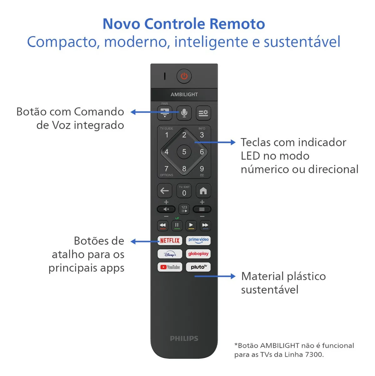 Experimente a nova geração de entretenimento em casa com a Smart TV Philips 50″ 4K 50PUG7300. Este modelo combina uma incrível resolução 4K UHD com uma tela DLED para proporcionar imagens nítidas e vibrantes, enquanto a relação de contraste de 1:200000 traz uma profundidade de cor excepcional. Com um tempo de resposta de apenas 8 ms e uma taxa de atualização de 60 Hz, os movimentos rápidos são reproduzidos com clareza, tornando-a ideal para jogos e filmes. A Philips 50PUG7300 integra-se perfeitamente à sua casa inteligente com assistentes virtuais que funcionam com Alexa e Apple Home, permitindo que você controle sua TV apenas com sua voz. Além disso, você pode aproveitar os aplicativos mais populares como Netflix, YouTube e HBO, todos acessíveis diretamente da sua tela. Com armazenamento de 8 GB e um processador de 4 núcleos, essa Smart TV oferece uma experiência de navegação rápida e eficiente. Desfrute de um som imersivo com modos de som Dolby Atmos e DTS-X, complementando sua experiência visual com áudio de alta qualidade. Possui conectividade Bluetooth e Wi-Fi, além de várias portas HDMI e USB, garantindo que você possa conectar todos os seus dispositivos favoritos facilmente. O suporte VESA incorporado e o design elegante em preto se ajustam a qualquer ambiente, proporcionando uma estética moderna ao seu espaço. A Philips 50PUG7300 é uma escolha excelente para quem busca tecnologia e funcionalidade. Com uma visualização de até 178° em ambos os ângulos, você poderá compartilhar momentos com amigos e familiares sem perder a qualidade da imagem. Coloque-se no centro da ação com esta Smart TV versátil e poderosa.