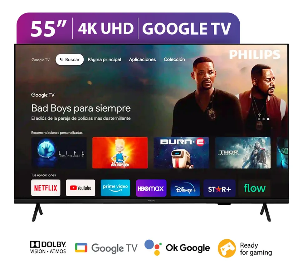 SMART TV PHILIPS 55″ GOOGLE 4K UHD -Tela: 4K Ultra HD (3840 x 2160), HDR10, Dolby Vision, Pixel Precise Ultra HD -Smart TV: Android TV 10 com Google Assistant, Netflix, YouTube, Disney+, Amazon Prime Video -Som: Dolby Atmos, 20 W (2 alto-falantes de 10 W) -Conectividade: Wi-Fi, Bluetooth 5.0, 4 HDMI, 2 USB, Ethernet, saída óptica -Consumo eficiente: Classe de energia A, modo Eco, sensor de luz -Dimensões: 958,4 x 568,4 x 82,1 mm (sem suporte), peso 7,12 kg -Ideal para streaming de entretenimento e excelente qualidade de imagem.