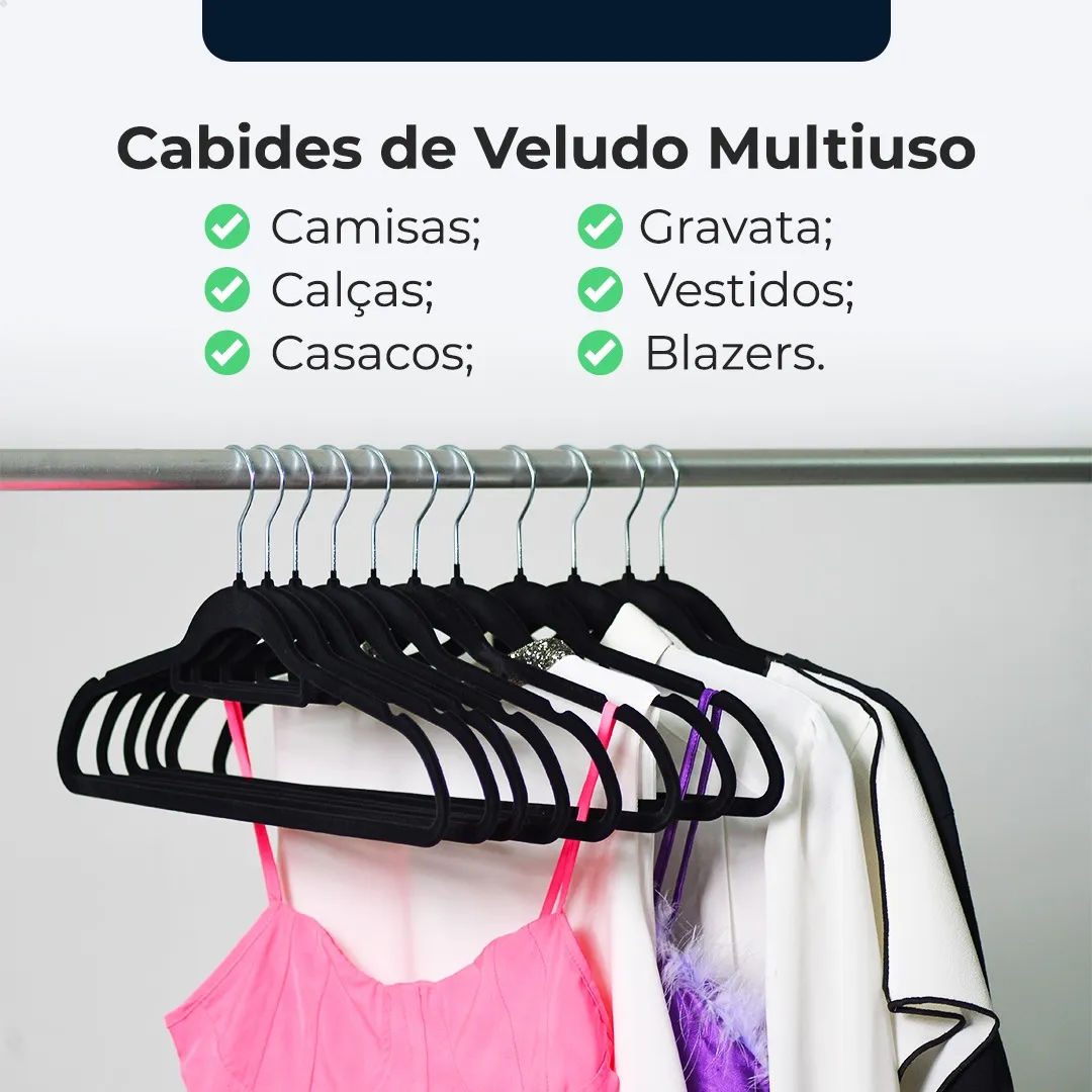 Kit 50 Cabides Veludo Preto Vittak TRANSFORME SEU GUARDA ROUPA O Kit de 50 Cabide Adulto de Veludo Vittak na cor Preto Antideslizante de 45 cm, combina organização, elegância e eficiência, proporcionando a melhor solução para manter suas roupas impecáveis e bem dispostas. Especificações Técnicas: – Quantidade: 50 cabides ultrafinos (Slim) de 45 cm. – Material: Luxuoso veludo Premium que evita escorregamento e amassados. – Design: Cabides com acabamento elegante e Slim, elevando o estilo do seu armário. – Economia de Espaço: Perfil slim que maximiza a capacidade do guarda-roupa. – Versatilidade: Adequado para diversos tipos de roupas: camisetas, camisas, calças, vestidos, entre outros. – Gancho Giratório: Rotação de 360° para facilitar o acesso às suas peças. Nossos cabides não só embelezam o seu espaço como também garantem a durabilidade e resistência necessárias para proteger suas roupas. O veludo premium utilizado oferece um toque suave, permitindo que seus itens permaneçam sem amassados e sempre prontos para uso. Experiência do Usuário: Os cabides são leves e fáceis de manusear, minimizando o esforço ao organizar suas roupas. Seu design ergonômico proporciona conforto no dia a dia, enquanto o gancho giratório facilita a acessibilidade ao seu armário. Prazos e Suporte: Aproveite a entrega rápida! Todos os nossos produtos estão disponíveis para pronta entrega em território nacional. Nossa equipe está à disposição para oferecer suporte ao cliente sempre que precisar. Invista na organização do seu guarda-roupa. Experimente agora mesmo os Cabides de Veludo Premium! Adicione sofisticação à sua rotina e descubra como é fácil manter suas roupas sempre perfeitas. Peça já o seu kit!